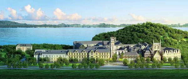 根据用地起伏、靠近松山湖水域的地理位置.点,结合瑞士.具历史性的古城和修道院建筑,通过棕红色瓦斜坡屋.和绿色砂岩外墙等.征,打造面向湖畔的斜面风景.